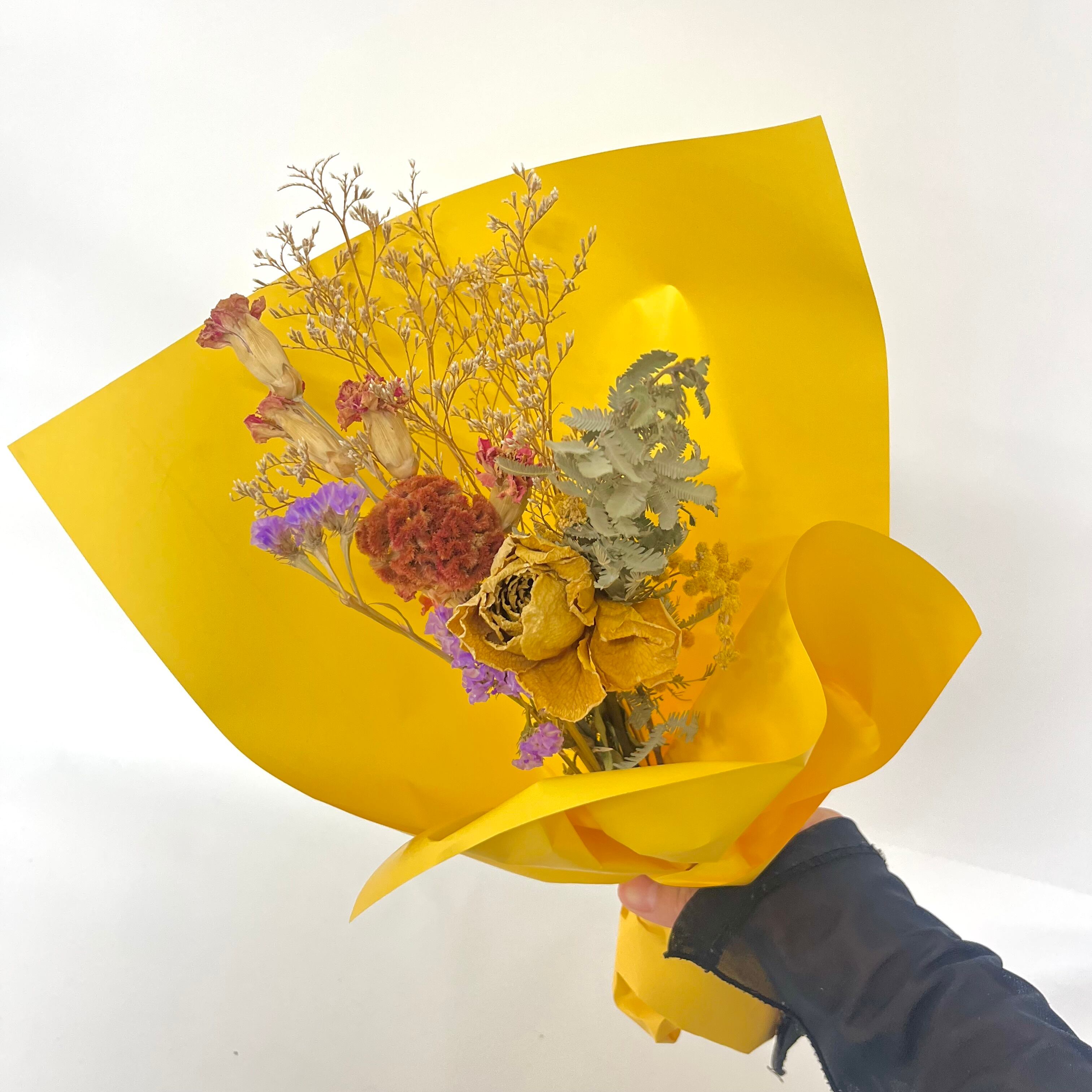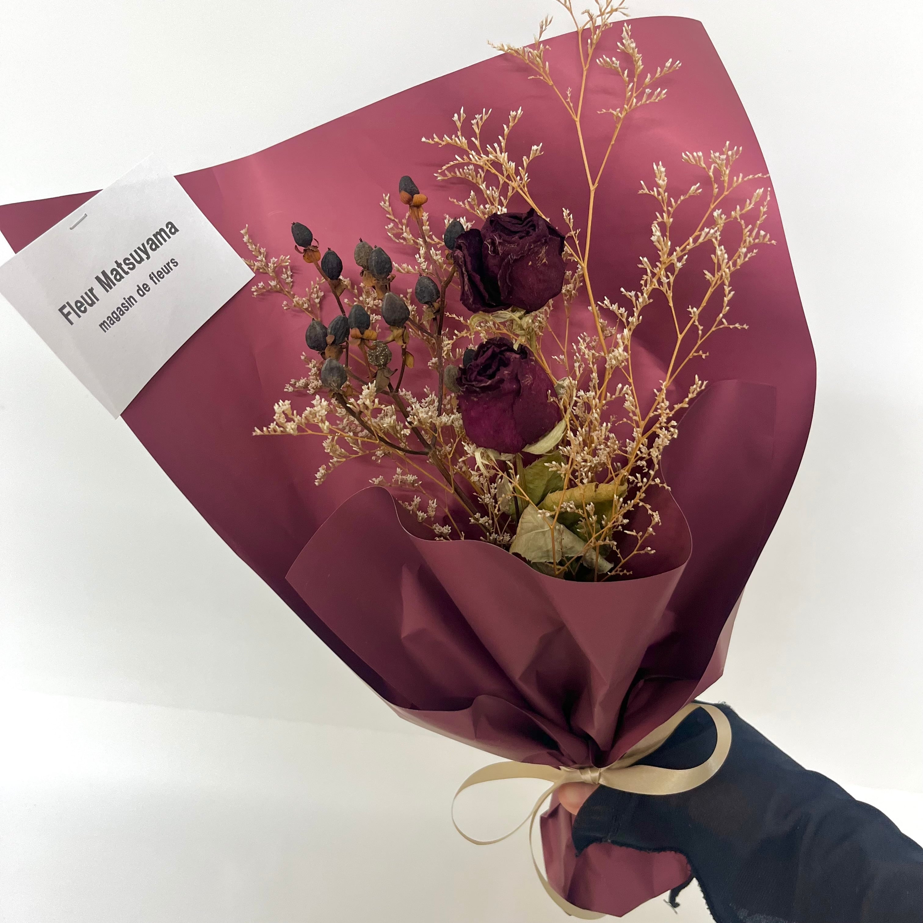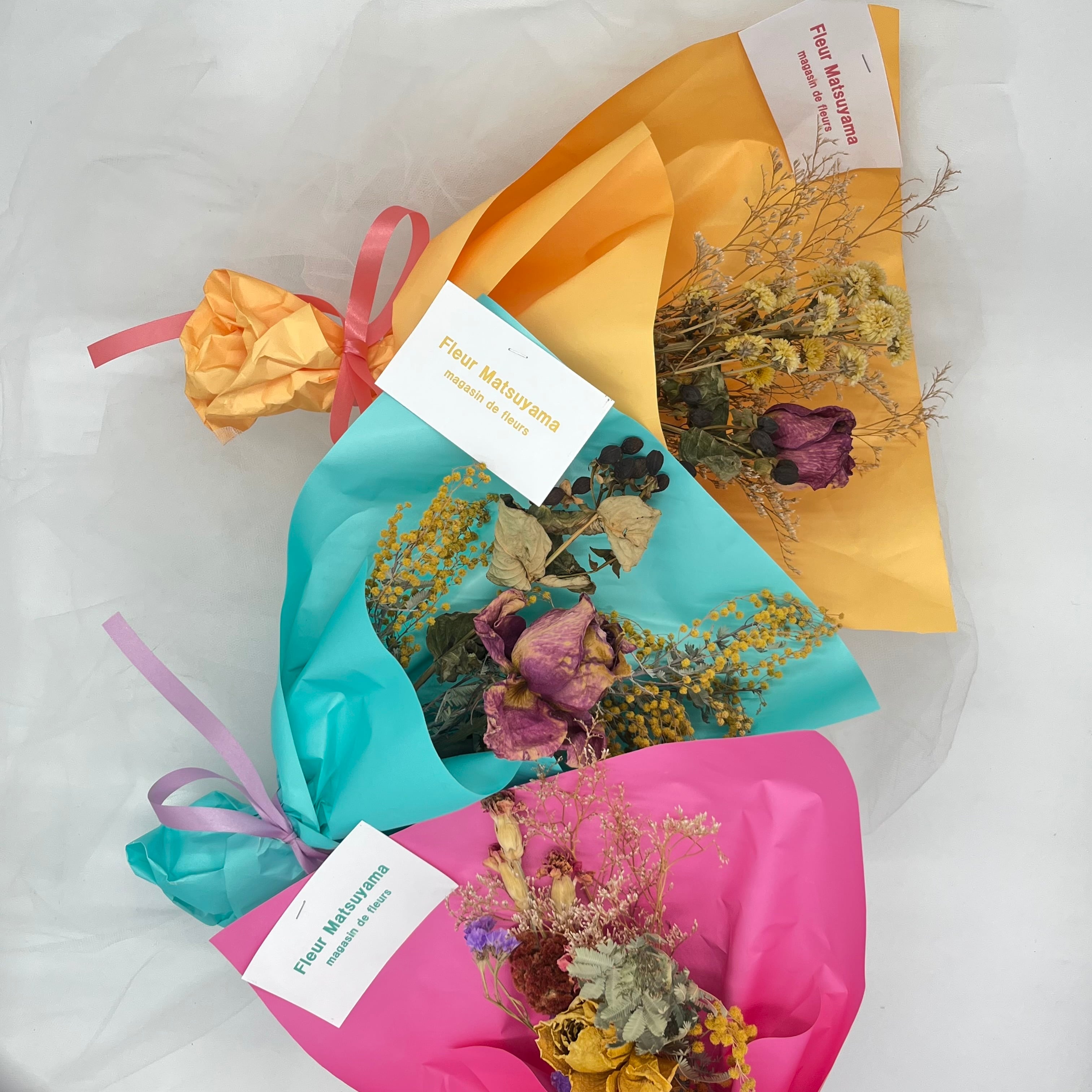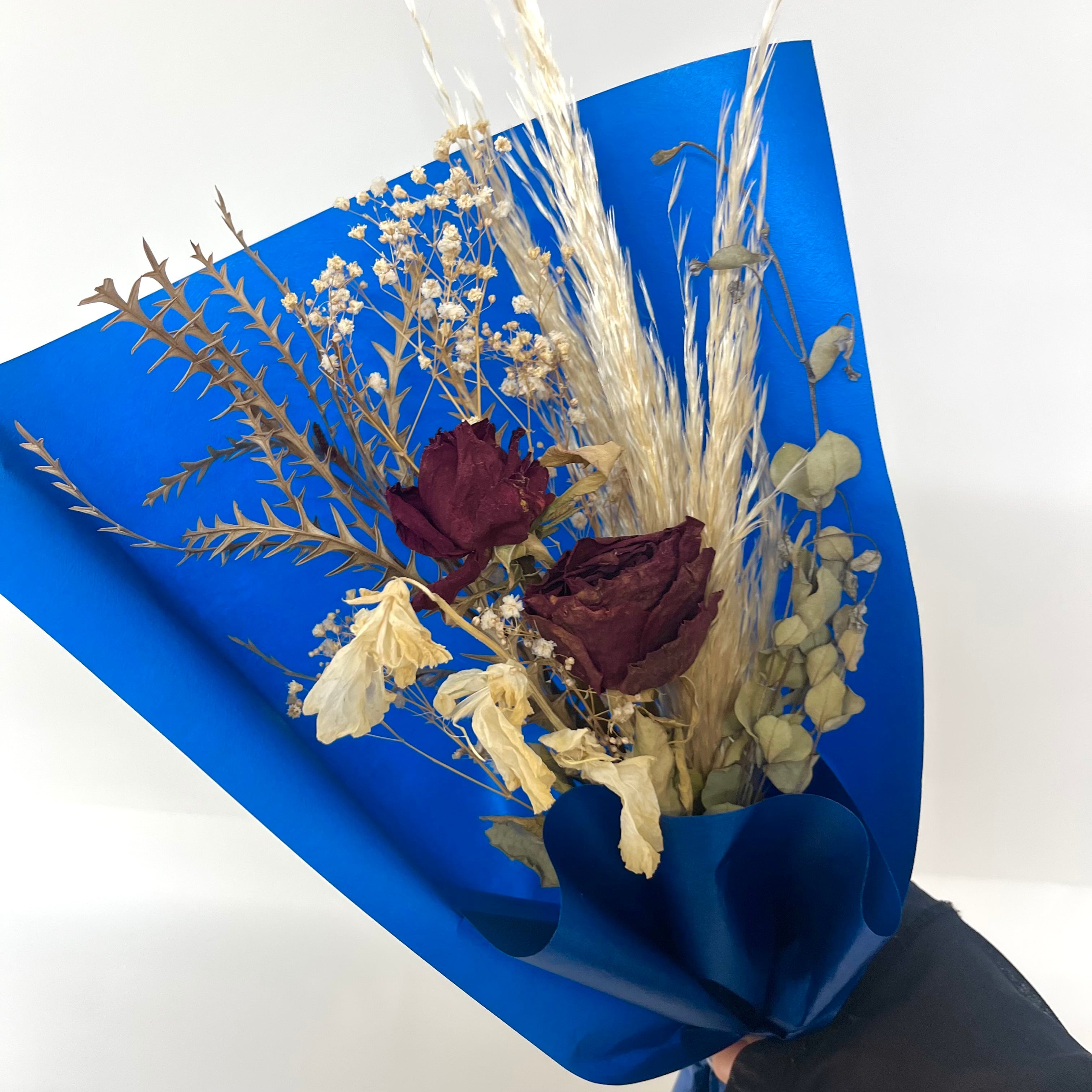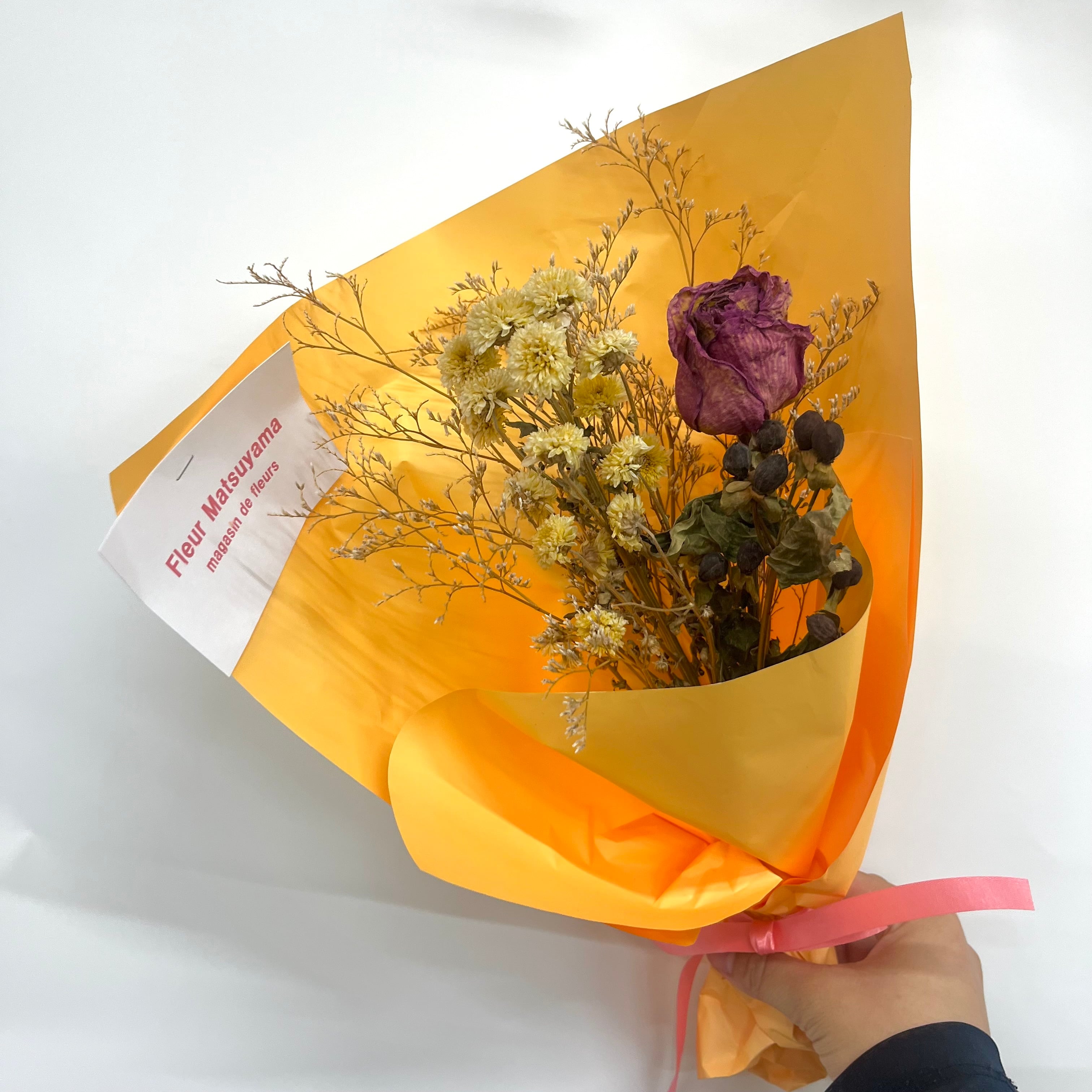 ドライフラワーの特性上、直射日光や高温多湿を避け、風通しの良い場所で保管することで美しさを長く楽しむことができます。お手入れは簡単で、埃は優しく払ってください。