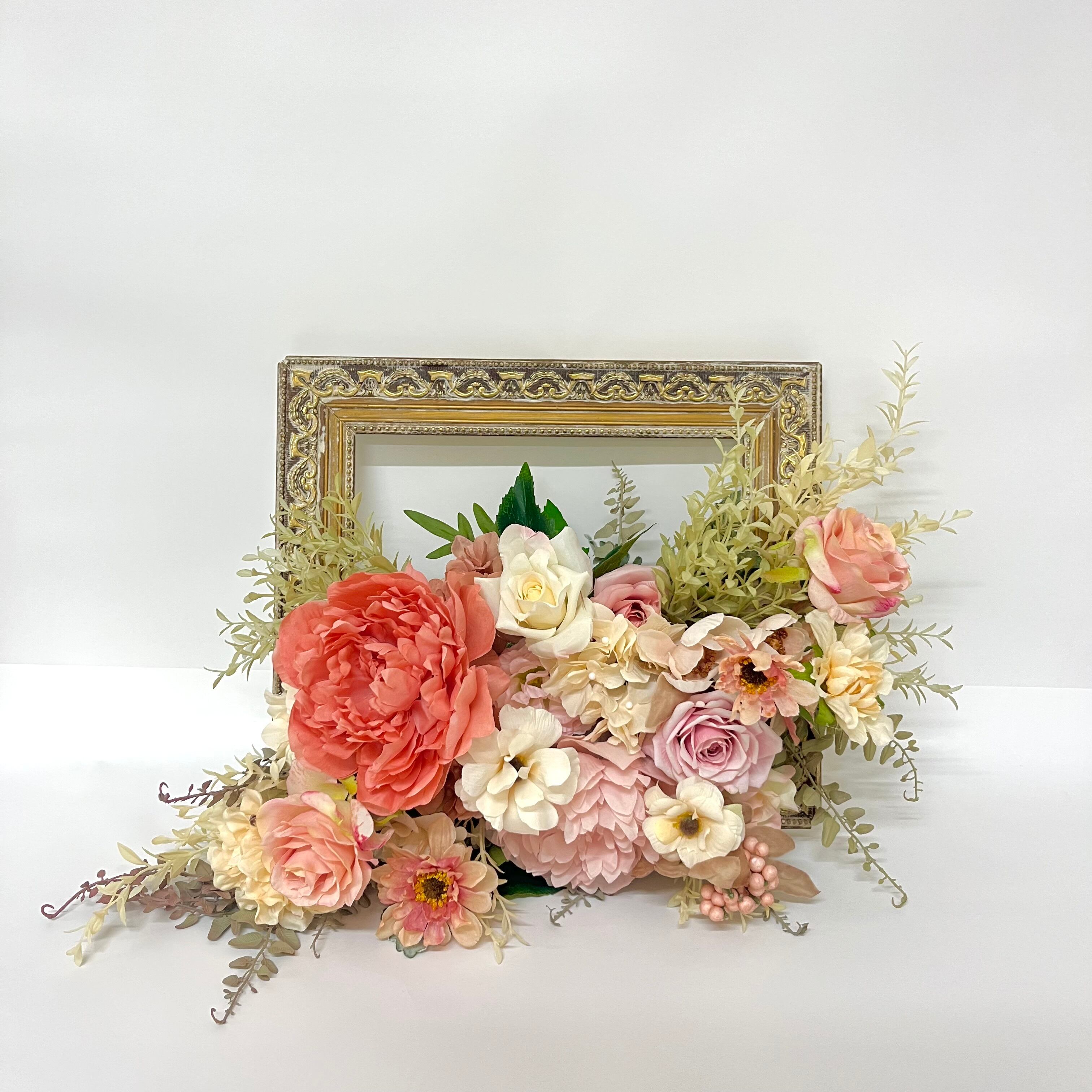 額縁のサイズ縦30cm×横35cm、ナチュラルながらに存在感のあるデザインです。色合いは多彩で、愛らしさと上品さを兼ね備えたアーティフィシャルフラワーがたっぷりと詰まっています。