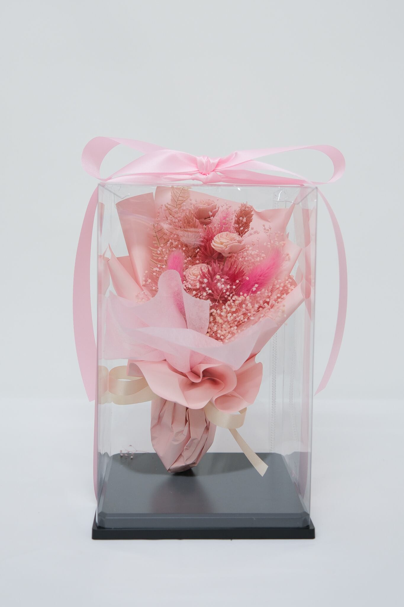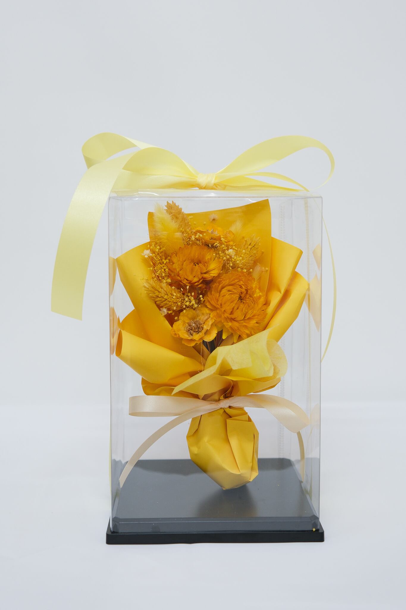 ドライフラワーの花束をボックスに詰め込みました。